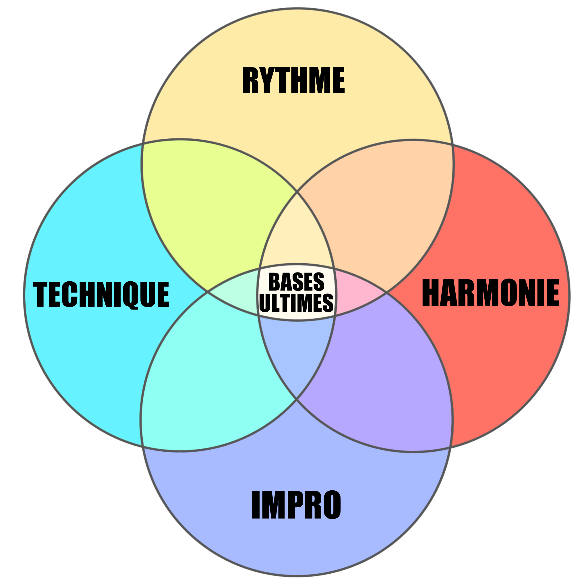 • Le rythme est indissociable de la technique, qui elle-même nous permet de nous exprimer en improvisation, et l'harmonie nous aide à nous repérer en musique.